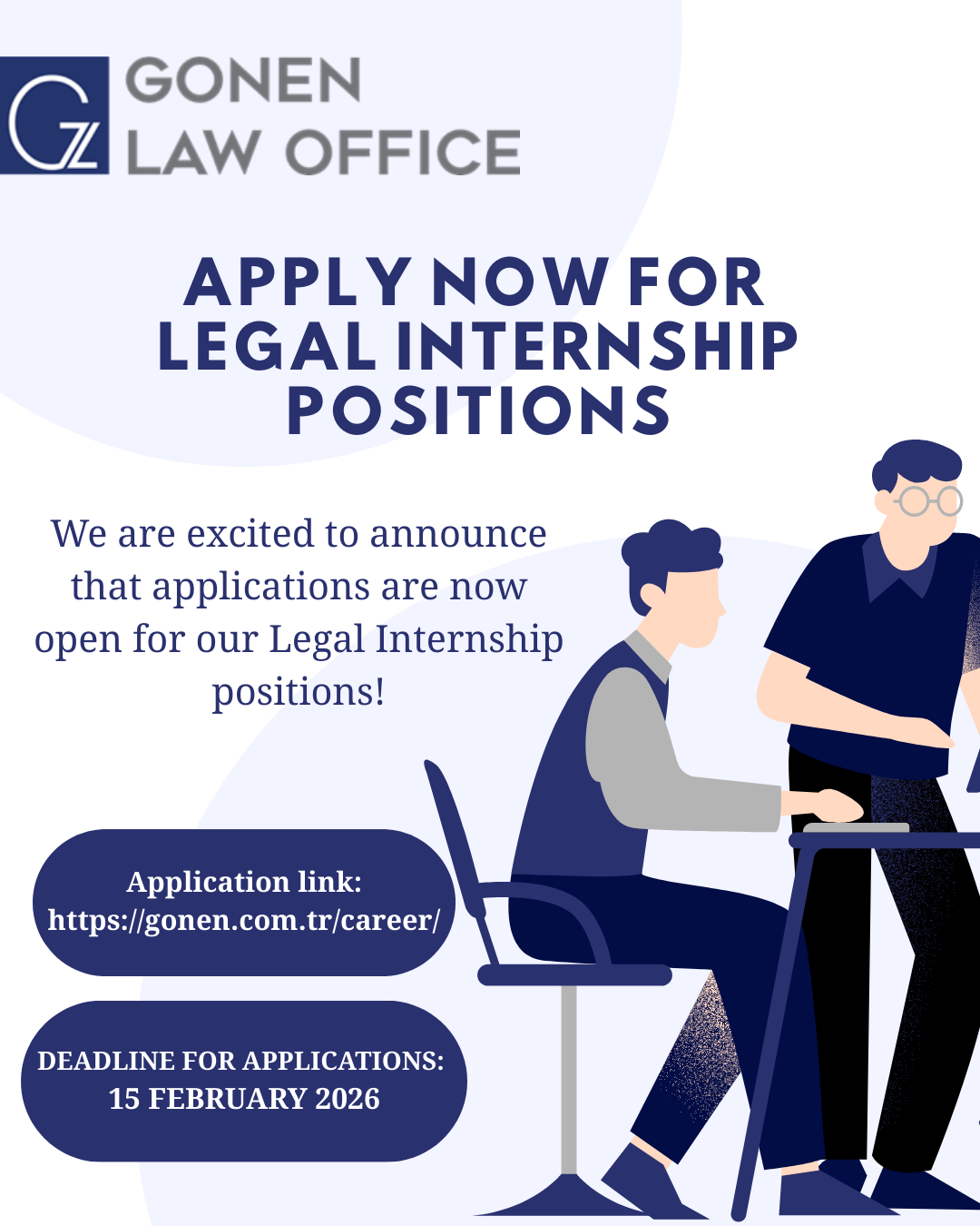 Gonen Law Offices seek applications from highly qualified and dedicated individuals who demonstrate strong potential, solid work ethics, and a commitment to excellence. Those interested in Legal Internship positions are invited to submit their CVs, along with TOEFL or IELTS test scores to hr@gonen.com.tr by 15 February. Only the applications with minimum scores of 105 for TOEFL and 7.0 for IELTS will be taken into consideration. Applicants are kindly requested to ensure that their CVs include their grade point average (GPA).