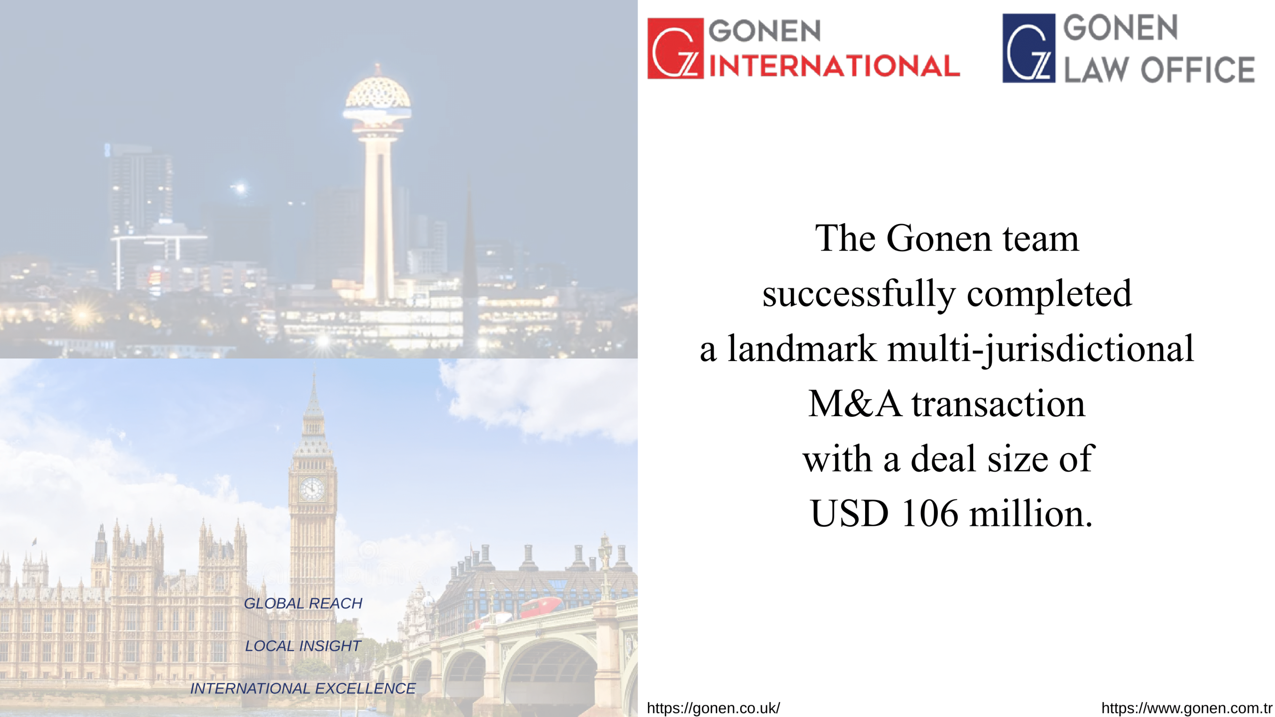 Gonen Law Offices Ankara and Gonen International Ltd London advised the seller on the 100% share transfer of a Cyprus-based limited company to a Dubai-based LLC, with a deal size of USD 106 million.