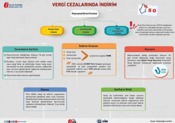 Vergi cezalarında indirim, mükellefler veya vergi sorumluları adına kesilen cezalar hakkında, yargı yoluna gitmeksizin, uyuşmazlıkların idari aşamada kısa ve barışçıl yoldan çözümlenmesini esas alan bir uygulamadır. Vergi gelirlerini artırmaya yönelik olarak borçların tahsil edilebilmesi için çalışan Gelir İdaresi Başkanlığı (“GİB”) mükelleflerin ve vergi sorumlularının vergi cezalarını indirimli ödemesine ilişkin 213 sayılı Vergi Usul Kanununun (“VUK”) 376. maddesini esas alan bir bilgilendirme broşürü hazırlamıştır. Hazırlanan “Vergi Cezalarında İndirim Broşürü” 28/07/2024 tarihli ve 7524 sayılı Kanunla yapılan değişiklikler kapsamında güncellenmiştir.